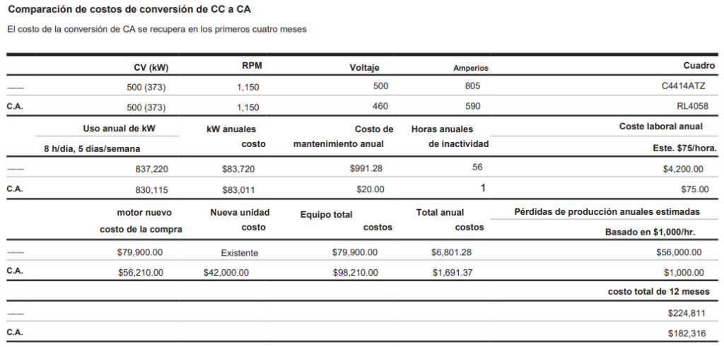 El siguiente escenario compara un motor de CC de 500 Hp reemplazado por un motor de CA de 500 Hp RPM y un variador de frecuencia.